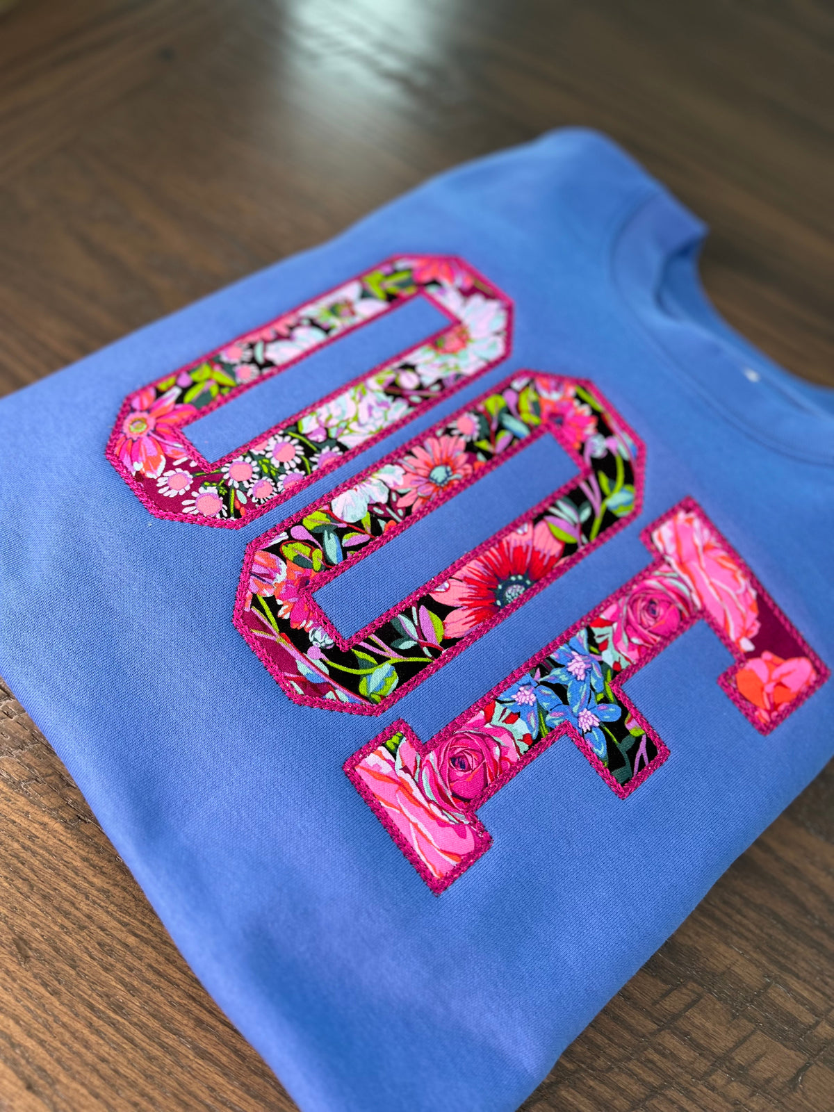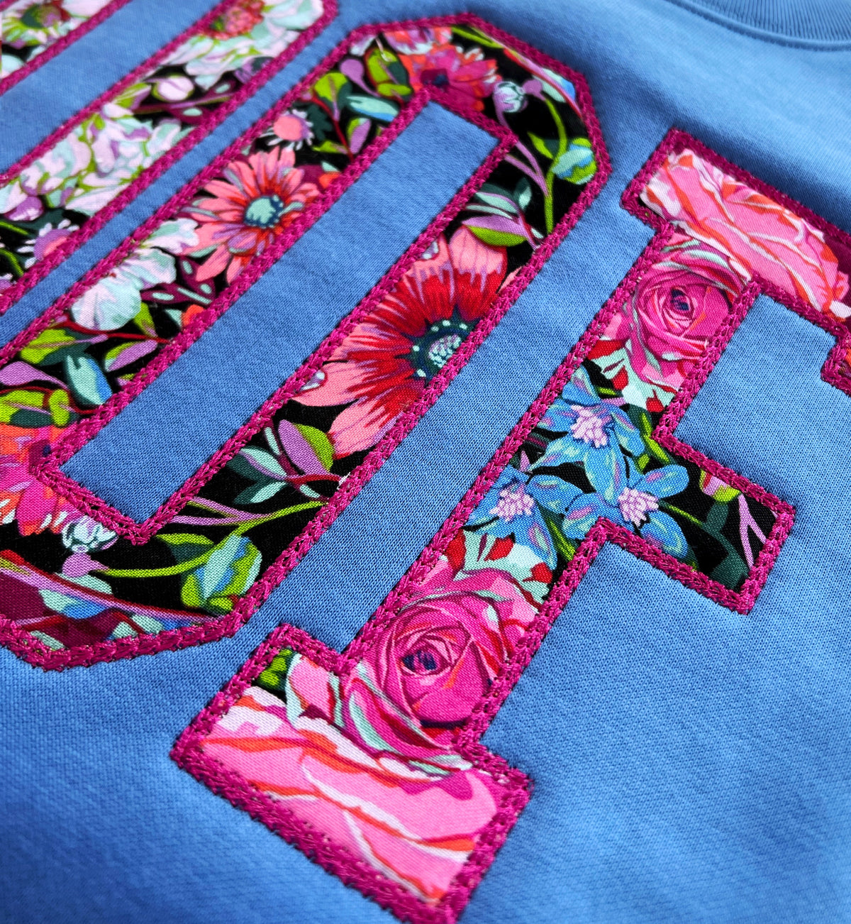 Each piece is crafted with appliqué embroidery — hand-cut floral fabrics framed in a decorative satin border, placed on premium crews and tees. ✨Just enough meticulous detail and a dash of unmedicated precision to make meltdown-wear look adorable.